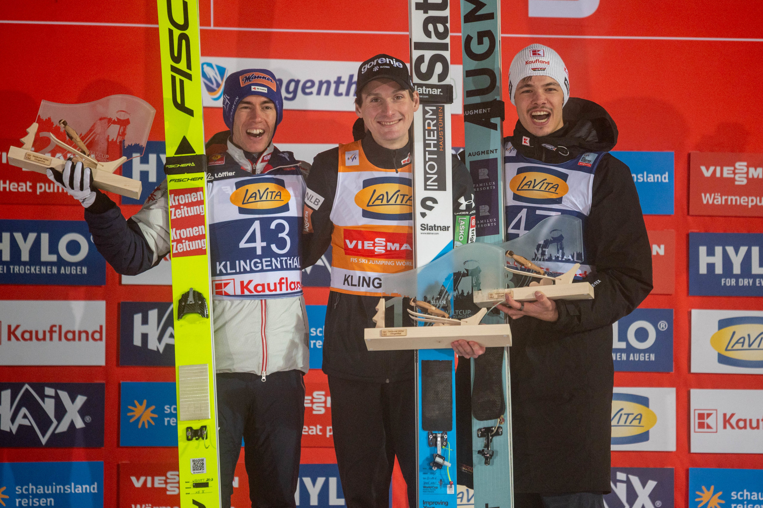 Mit dem Wettkampf der Herren zog sich nach und nach der Nebel über die Schanze am Schwarzberg. Doch davon ließen sich Athleten und die insgesamt 7842 Zuschauer nicht die Stimmung vermiesen. Der Kessel in der Arena bebte und sie hatten auch allen Grund dazu. Nach dem ersten Wertungsdurchgang ging noch der Qualifikationssieger des Vortages, Phillipp Raimund, in Führung. Im zweiten Durchgang reichte es dann nur für einen guten dritten Platz, denn an diesem Wettkampf-Samstag war ein Mann nicht zu stoppen. Der Slowene Domen Prevc sorgte nach seiner Schwester Nika für den zweiten Sieg der slowenischen Flug-Asse und baut damit seine Gesamtführung im Weltcup weiter aus. Mit atemberaubenden Sprüngen auf 142,5 und 143 Meter, trotz schlechter Sicht, setzte er die Tagesbestweiten. Hinter ihm der frisch gebackene Vater aus Österreich, Stefan Kraft, der nun auch wieder ein Wörtchen in der Gesamtwertung mitreden will. |